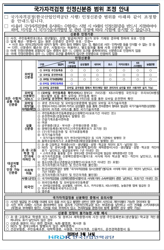 [공지] 국가자격 인정신분증 범위 조정 안내 (적용일 : 2026.3.14.~)